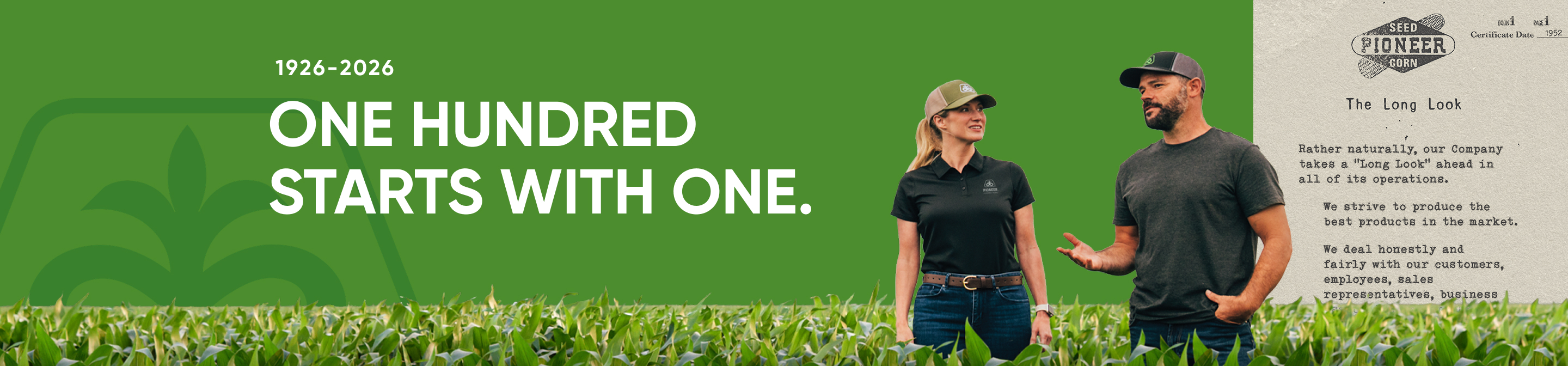 This 100-year milestone would not have been possible without the farmers, Pioneer Sales Representatives and employees who have supported us through the years. Thank you for your hard work, resilience, partnership, and trust over the past century. Here's to you and what's next.