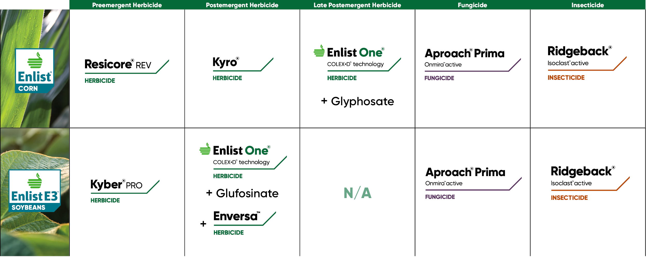 Enlist E3® soybeans are jointly developed and owned by Corteva Agriscience LLC and M.S. Technologies, LLC. Enlist One is the only 2,4-D product authorized for use in Enlist crops. Not all products are registered for sale or use in all states or counties. Enversa™, Kyro®, and Resicore® REV are not available for sale, distribution or use in Nassau and Suffolk counties in the state of New York. Contact your state pesticide regulatory agency to determine if a product is registered for sale or use in your state or area. Consult the label before purchase or use for full details. Always read and follow label directions.
