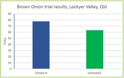 The strong results were also reported from an onion trial site in the Lockyer Valley. Utrisha N was applied at the four-to-six leaf stage in conjunction with a standard fertiliser program of Preplant NPK blend, followed by in-crop soluble potassium nitrate and micronutrient program. Brown onion yield increased by 22.5% and red onion by 10%, compared to onions subject to the standard fertiliser program.
