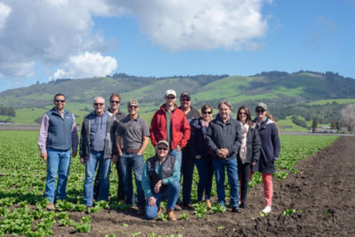 Australian delegates visit lettuce farm (left to right) Lupe Carrillo - PCA for Nutrien Watsonville Branch, Peter Biddulph, Nicholas Koch, Courtney Piesse, Edward Windley, Darren Rathjen, Genevieve Windley, Kim Martin, Yvette Rathjen, Lauren East, (front) Bill Seaman - Territory Manager for Corteva Agriscience USA