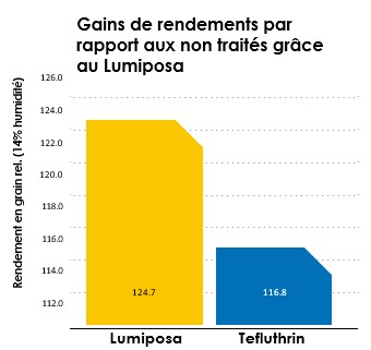 Sur les 14 essais grain mis en place par la recherche CORTEVA, il semble que dans 94% des cas, une augmentation de rendement de 24,7% a été mesurée vis-à-vis du témoin non traité et de 7.9% vis-à-vis de la Tefluthrin CS20.