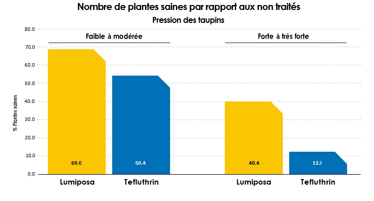 Lumiposa a une très bonne efficacité contre les larves de taupins, même en cas de fortes infestations. La larve de taupin ou encore appelée « ver fil de fer » est issue de l’insecte adulte (Agriotes) appartenant aux Coléoptères. Le traitement avec Lumiposa donne de bien meilleurs résultats que la téfluthrine 20CS. Sur 27 essais, on a observé 50 % de dégâts en moins par rapport au non traité et 16,3 % de dégâts en moins par rapport au traitement avec téfluthrine 20CS. Lumiposa en traitement de semences de maïs a été reconnu efficace contre les larves de taupins et les vers gris (chenilles de noctuelles - Agrotis).