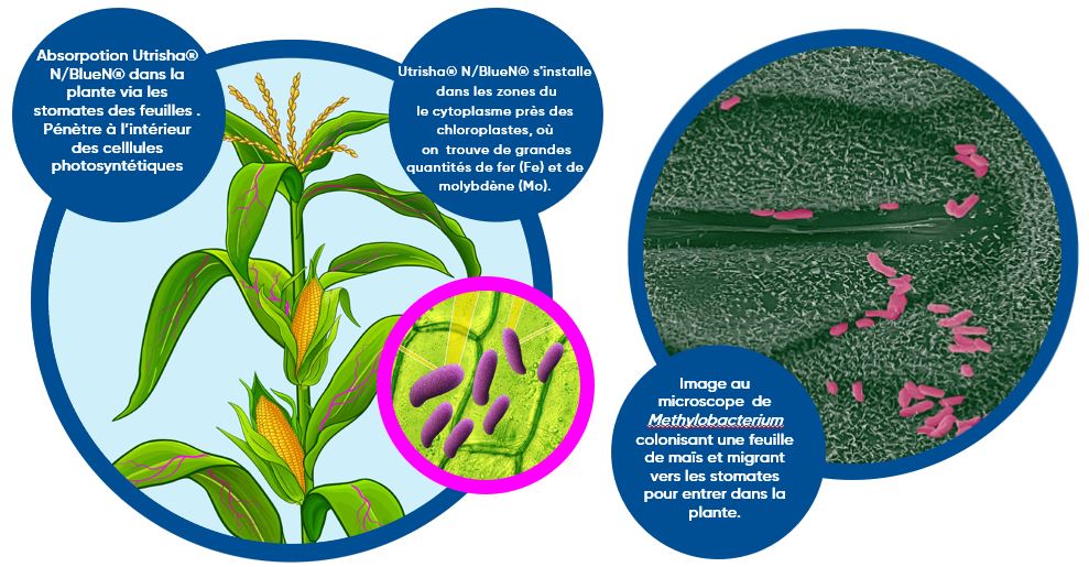 Utrisha® N / BlueN® s’utilisent au début de la culture et pénètre dans la plante via les stomates. Lors de la pulvérisation, la bactérie est attirée par le méthanol qui s’échappe des stomates. Il s’ensuit une colonisation de toute la partie aérienne de la plante. Le processus de fixation d’azote peut alors commencer. Les premiers apports d’azote sont observés 7 jours après l’application. La bactérie colonise l’ensemble de la partie verte la plante 2-3 semaines après l’application.