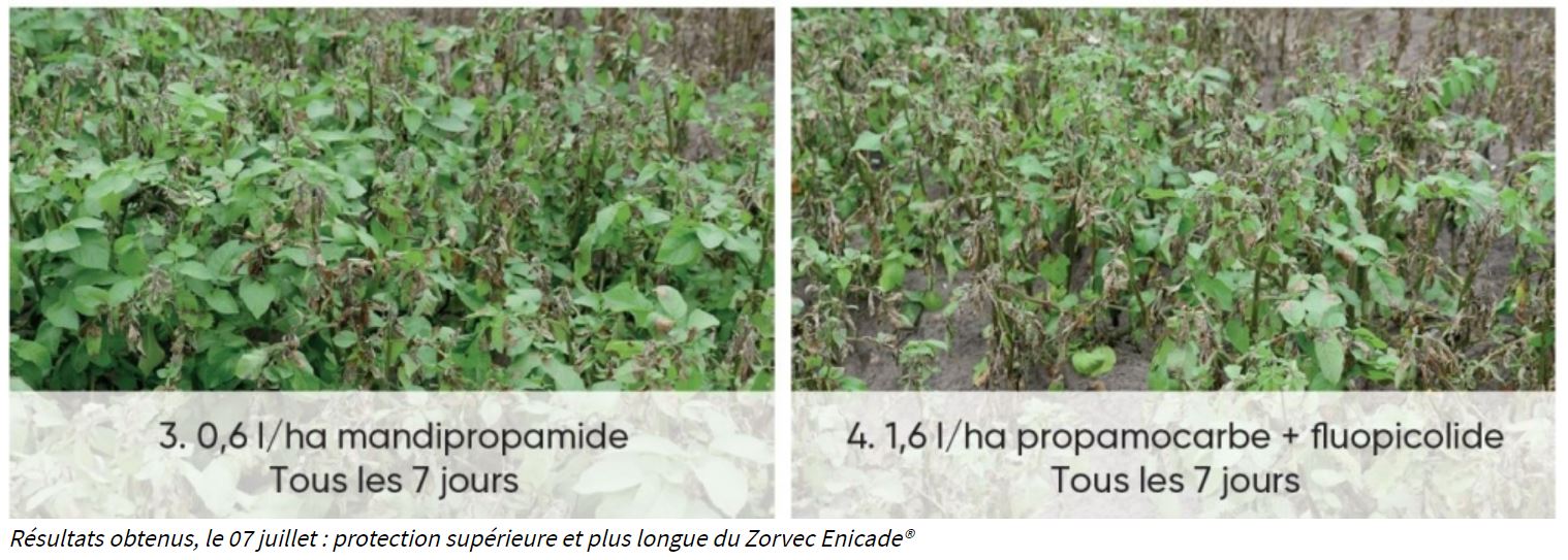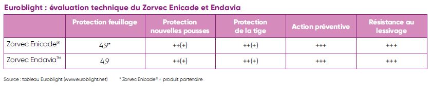 Zorvec Enicade et Endavia démontrent une excellente efficacité sur le mildiou de la feuille (note la plus élevée) et de la tige tout en protégeant les nouvelles feuilles.