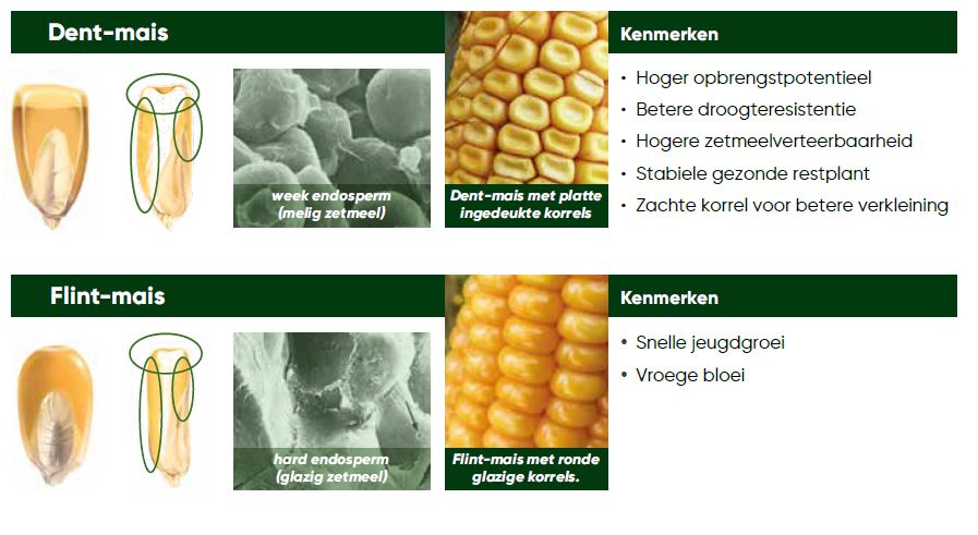 Het zetmeel in de korrel bij Flint-mais is sterk gebonden en zit vastgeklit door een specifieke eiwitstructuur, eigen aan Flint. Het zetmeel in een Dent-korrel daarentegen is veel minder sterk gebonden en komt veel makkelijker vrij.