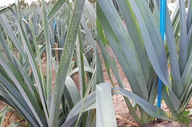 Links : Tripsaantasting in onbehandelde prei. Rechts : Prei behandeld met Spinosad en suiker.