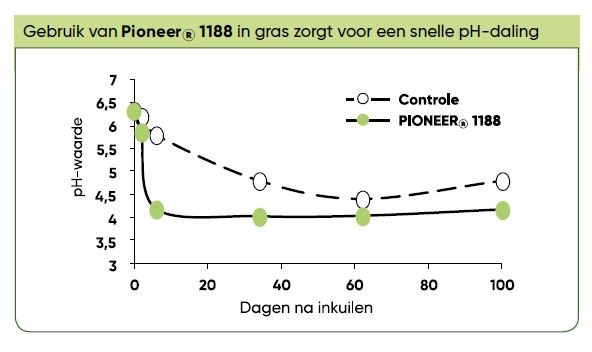 Het proces van conservering kun je versnellen door de juiste melkzuurbacteriën toe te voegen, met een inkuilmiddel zoals 1188 bijvoorbeeld. 1188 concentreert zich volledig op de vorming van melkzuur. Koppelman: ‘Elke bacteriestam werkt optimaal in een bepaald traject van de pH, waarbij de ene stam het overneemt van de ander. Een soort estafette, dus. Zo daalt de pH in de graskuil en wordt de kuil toch snel stabiel. Door de versnelde conservering wordt de kwaliteit zoveel mogelijk behouden. Ook de smakelijkheid en voederwaarde blijven beter behouden.’