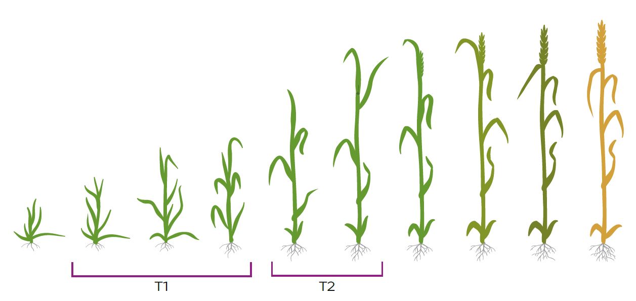 Vanaf begin oprichting (T1) tot stadium laatste blad (T2) of begin aarvorming.