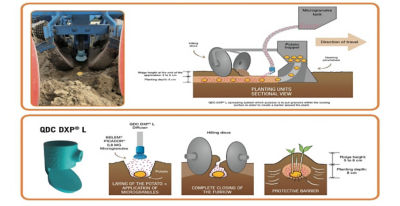 SHERPA 0.8 GR beschermt de aardappelen tegen ritnaalden wanneer deze goed verdeeld wordt in het bed tijdens het planten. De oplosbaarheid van het product en de verdeling door de bodem na toepassing is beperkt. Een goede verdeling in het bed tijdens het planten is daarom belangrijk. Onderstaande figuur laat dit goed zien. De verdeling vindt plaats met deze getoonde verdeler, waardoor het product ‘breed’ in het bed wordt verdeeld. Na het dichten van het bed, zit SHERPA 0.8 GR goed verdeeld rondom de aardappel om zo een barrière te vormen tegen de ritnaalden.