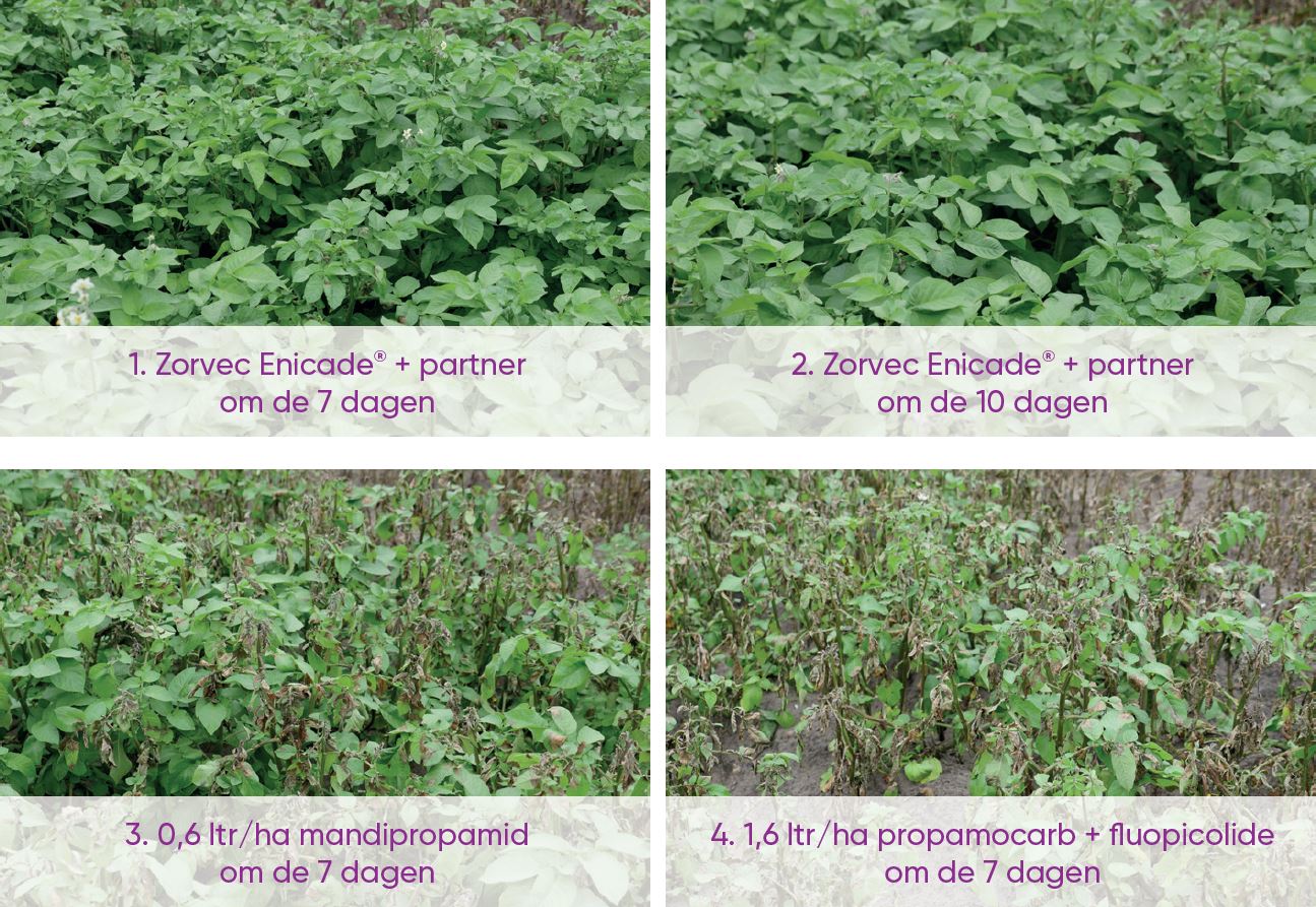 De twee bovengenoemde behandelingen (1+2) met Zorvec® werden vergeleken met twee veel gebruikte standaardmiddelen (3 + 4). De planten die om de veldjes stonden zijn enkele dagen (16 juni) na de behandelingen (10 juni) kunstmatig geïnfecteerd met Phytopthora. Ongeveer één maand later (7 juli) zijn er foto's gemaakt van de aardappelplanten met verschillende behandelingen. Het resultaat: Zorvec® i.c.m. een partnerproduct beschermd langer èn beter.