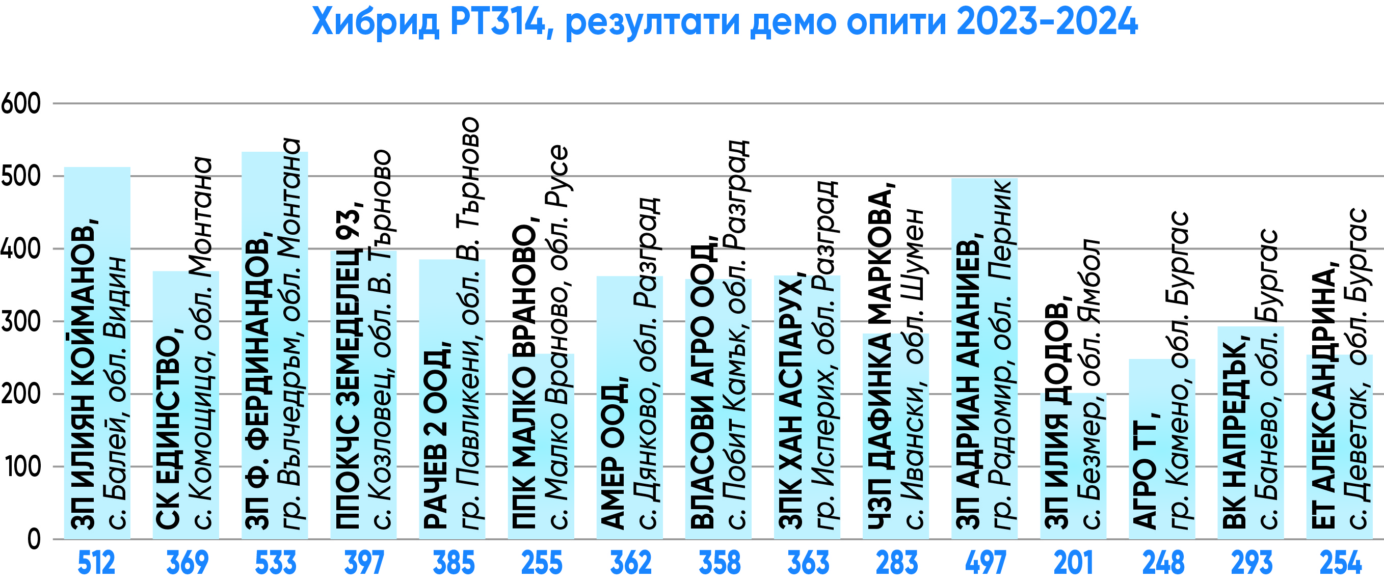 PT314 – нов ранен хибрид, който е със следните практически предимства: най-отличителната характеристика че, е с нов ген НМХ за най-високо ниво на устойчивост на преждевременно разпукване на шушулките преди жътва, като е еквивалентен с най-добрите стандарти в практиката. Хибридът е с висок добивен потенциал, вкл. при намалено азотно торене, с нов подобрен ген Rlm7, осигуряващ „двойна“ генетична защита срещу най-важната болест – ФОМА, с отлично и бързо развитие наесен, силен vigor ефект, бързо възстановяване на растежа на пролет след презимуване, с устойчивост на TuYV вируса, причиняващ жълта вироза. РТ314 е широкоадаптивен хибрид, подходящ за отглеждане в цяла България и цяла Европа, и е в Топ 6 на най-отглежданите хибриди рапица на Corteva в Европа, като се отглежда масово и с успех в Дания, Германия, Полша, Франция, Румъния и Словакия. За сезон 2023-2024 година в България на демонстрационни полета РТ314 даде следните добиви: