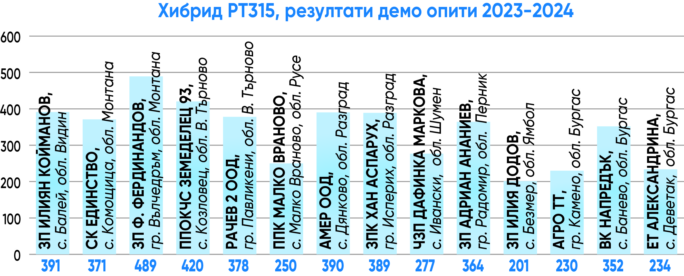 PT315 – нов средноранен хибрид, който е със следните практически предимства: и при PT315 най-отличителната характеристика че е с нов ген НМХ за най-високо ниво на устойчивост на преждевременно разпукване на шушулките преди жътва, като е еквивалентен с най-добрите стандарти в практиката. Хибридът е с висок добивен потенциал, с нов подобрен ген Rlm7, осигуряващ „двойна“ генетична защита срещу най-важната болест – ФОМА, с отлично и бързо развитие наесен, силен vigor ефект, бързо възстановяване на растежа напролет след презимуване, с устойчивост на TuYV вируса причиняващ жълта вироза. Той е широкоадаптивен хибрид, подходящ за отглеждане в цяла България и цяла Европа, и е в Топ 6 на най-отглежданите хибриди рапица на Corteva Agriscience в Европа, като се отглежда масово и с успех в Дания, Германия, Полша, Франция, Румъния и Чехия. За сезон 2023-2024 година в България на демонстрационни полета РТ315 даде следните добиви: