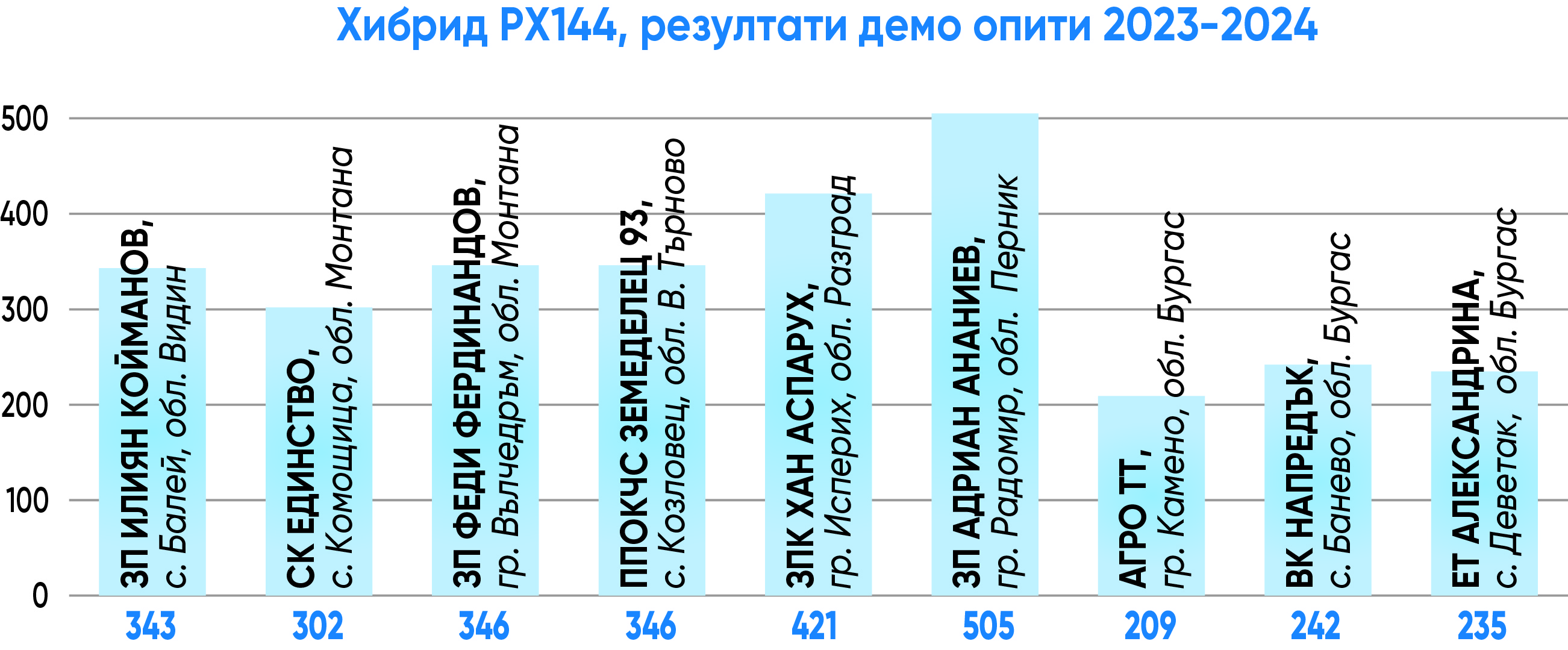 PХ144 – нов средноранен конвенционален хибрид от Pioneer® MAXIMUS® продуктовата линия, който се отличава със следните практически предимства: с висок добивен потенциал, здраво ниско устойчиво на полягане стъбло с максимелан брой разклонения, подходящ за отглеждане в цялата страна, с отлично развитие наесен, толерантен на сухи стресови условия, ниски температури. По отношение на болести РХ144 е толерантен на болестта склеротиния, а също така и на разпукване на шушулките. Отглежда се масово и с успех в Германия, Дания, Украйна, Чехия, Литва, Латвия и Естония. За сезон 2023-2024 година в България на демонстрационни полета РХ144 даде следните добиви: