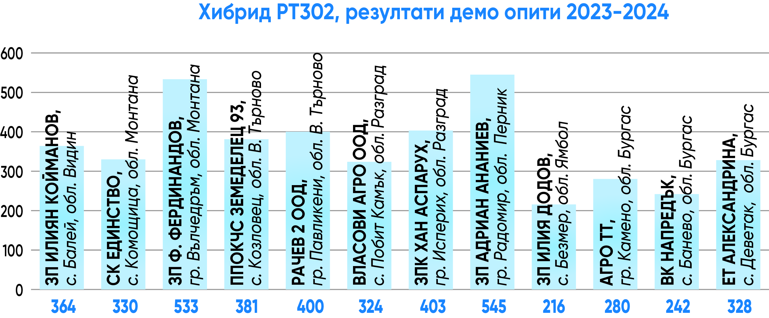 Другите нови хибриди на Corteva, успешно внедрени в практиката в България от 2022 година, които се отчетоха с подобаващи високи резултати са РТ302 и РТ303.