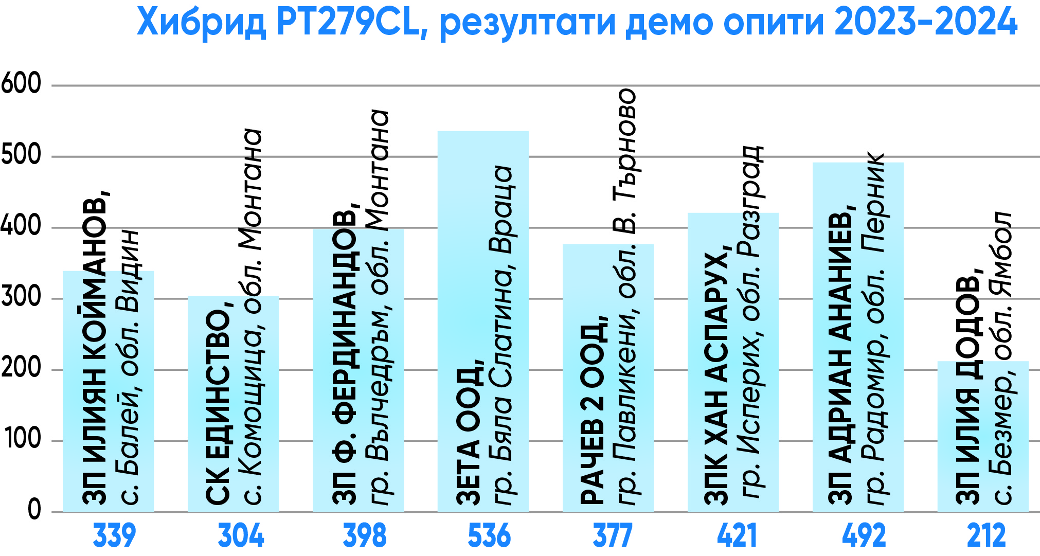 От високостъблената Clearfield® генетика предлагаме – РТ279CL – най-отглежданият Clearfield® хибрид на Pioneer в България и пазарен лидер в Clearfield® технологията в Германия. За сезон 2023-2024 година в България на демонстрационни полета РТ279 CL даде следните добиви: