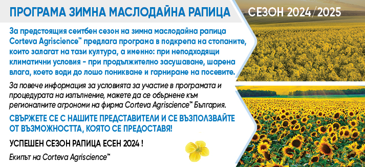 Най-новото и конкретно за сезон рапица 2024-2025, че Corteva Agriscience™ България предлага на земеделците, отглеждащи рапица специална програма за подкрепа на производството на рапица при неблагоприятно влияние от липсата на влага за непоникване и не добро гарниране на посева, вследствие липсата на влага. За повече подробности и информация се свържете с регионалните представители на Corteva Agriscience България.