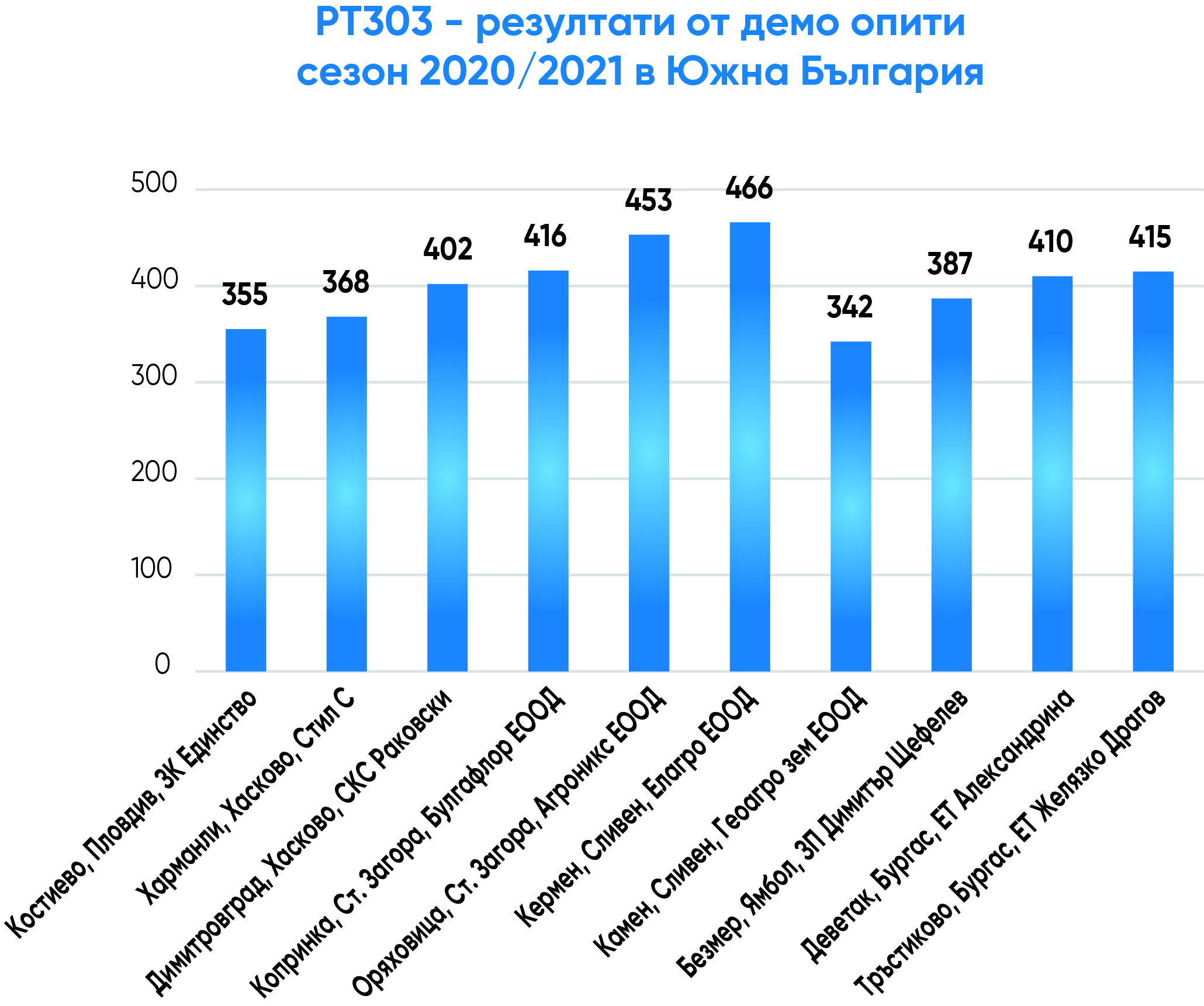 с изключително високо ниво на толерантност на болестта склеротиния. РТ303 е средноранен, с много висок и стабилен добивен потенциал, изключително гъвкав и адаптивен за отглеждане в цялата страна, с високо маслено съдържание (над 45%-46%), много висока толерантност на болестта склеротиния, разпукване на шушулките, на полягане, на студ и ниски температури, толерантен на TuYV вируса (официално сертифициран във Франция). РТ303 е с много добро представяне в официалните опити в Германия и Швеция (включително при по-студени климатични условия). РТ303 е включен в официалния препоръчителен лист на хибриди рапица за отглеждане на организацията AHDB във Великобритания и вече се отглежда в държави с дългогодишни традиции в тази култура – Германия, Великобритания, Чехия, Полша, Румъния, Дания и Унгария.