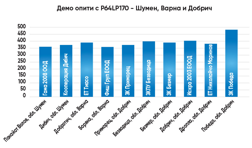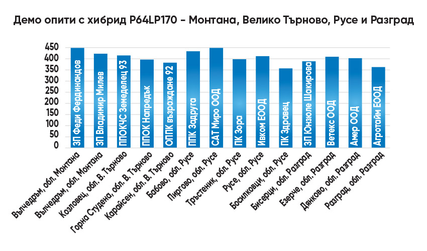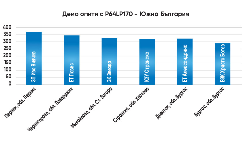 P64LР170 е нов средноранен хибрид, Clearfield® Plus версия на един от най-отглежданите и най- известни ExpressSun® хибриди в страната. С много висок и стабилен добивен потенциал при нормални и по-неблагоприятни условия, ранен цъфтеж и подходящ за отглеждане в цялата страна. С хомогенни еднакви пити, леко изпъкнали в средата, а зърната са едри, заоблени и подходящи за белене. С висока толерантност на лимитирани условия на влага и stay green ефект, добър здравен статус, високо маслено съдържание и Pioneer Protector® синя китка – устойчив на всички раси синя китка, идентифицирани до момента в страната, което позволява да се пропусне пръскане с имазамокс съдържащи хербициди срещу паразита. През 2021 година P64LР170 беше изпитан на демонстрационни опити в България, като в приложената графика можете да видите получените високи добиви, а също така и в каталога с добиви от демо опити и производствени полета 2021 година.
