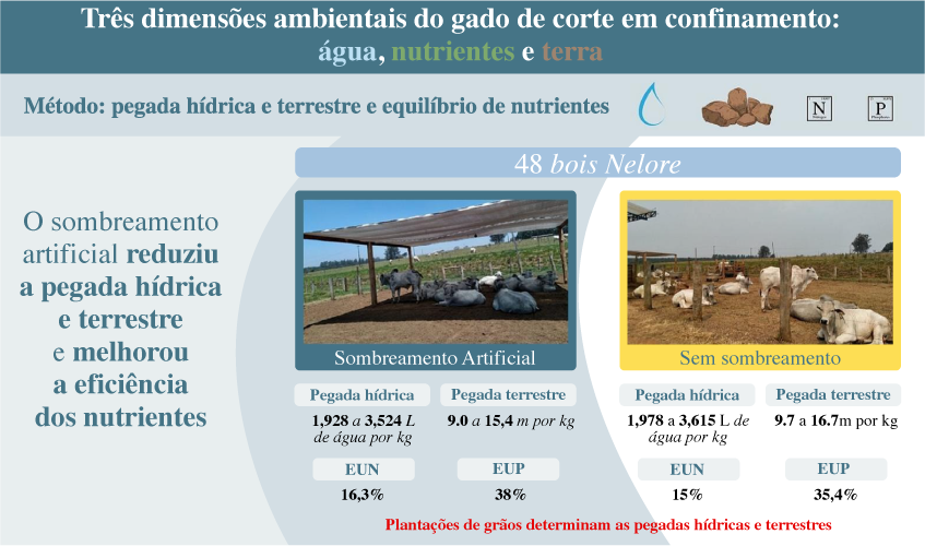 Sombra interfere na hidratação dos animais?Sim, e já existe comprovação em números. Um estudo da Embrapa Pecuária Sudeste (SP) foi considerado pioneiro em relação ao impacto de um sistema de confinamento bovino e mostrou que animais com acesso à sombra em confinamento demonstraram melhores eficiências de água, nutrientes e terra em comparação aos animais a pleno sol. Em média, as pegadas hídricas e terrestres no tratamento com sombra foram 3% e 7% menores, respectivamente, do que no tratamento debaixo do sol. O consumo médio total de água pelos animais - durante o ciclo produtivo a pleno sol - foi de 3.252 litros, 8% maior que no tratamento com sombreamento, cuja média foi de 2.983 litros. O consumo médio diário de água por animal (sem sombra) foi de 40 litros ao dia, enquanto nos casos com acesso à sombra foi de 36,8 litros ao dia. Adilson Aguiar também se baseia em outro experimento, esse conduzido com animais Nelore, descartes de um rebanho puro de origem, com idade inicial média de 12 meses e idade ao abate médio de 27 meses. Eles tiveram acesso a um sombreamento provido por sombrite, com provisão de sombra de 80%, e durante 15 meses ganharam 11% a mais que os animais que não tiveram acesso ao sombreamento. A temperatura sob o sombrite chegou a ser até 7 graus mais baixa do que sem o sombrite. “Na condição de conforto térmico, o animal perde menos água pela respiração e pelo suor, se mantendo mais hidratado e necessitando de menor ingestão de água. Nessa condição, os animais podem reduzir a ingestão de água em até 7 litros por dia”, indica Adilson. Outro ponto do experimento foi o abate com avaliação de carcaça. Os animais Nelore tiveram a gordura subcutânea 84% mais espessa, ou seja, a exposição ao sombreamento resultou em maior ganho médio diário e melhor cobertura de gordura na carcaça. Fonte: adaptado de https://www.sciencedirect.com/science/article/abs/pii/S0048969723053585?dgcid=author |