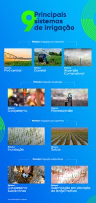 Sobre a irrigação é importante entender que não se trata de um único método, existem vários sistemas que proporcionam diferentes formas de ação. Para saber qual é o melhor, o agricultor precisa conhecer as vantagens e as limitações de cada um e investir no sistema que melhor atende às necessidades da sua cultura, da sua região e, também, do seu sistema financeiro.