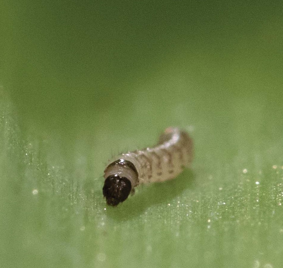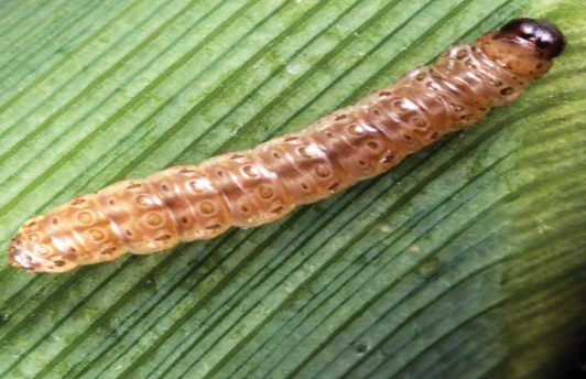 As lagartas recém-eclodidas se alimentam do parênquima celular das folhas. Após a primeira ecdise, elas penetram pela parte mais tenra do colmo e o perfuram, fazendo galerias. Quando se desenvolvem completamente, medem entre 22 e 25 mm, com cor amarelo-pálida e cabeça marrom. Dentro do colmo, se transformam em pupa de coloração castanha, fase que dura de 9 a 14 dias.