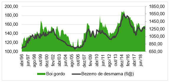 Para isso é preciso entender como funciona a mecânica de preços tanto do bezerro quanto do boi gordo. Os preços de ambas as categorias são altamente correlacionados (se comportam de maneira similar) e são influenciados pelas oscilações do ciclo pecuário de preços.