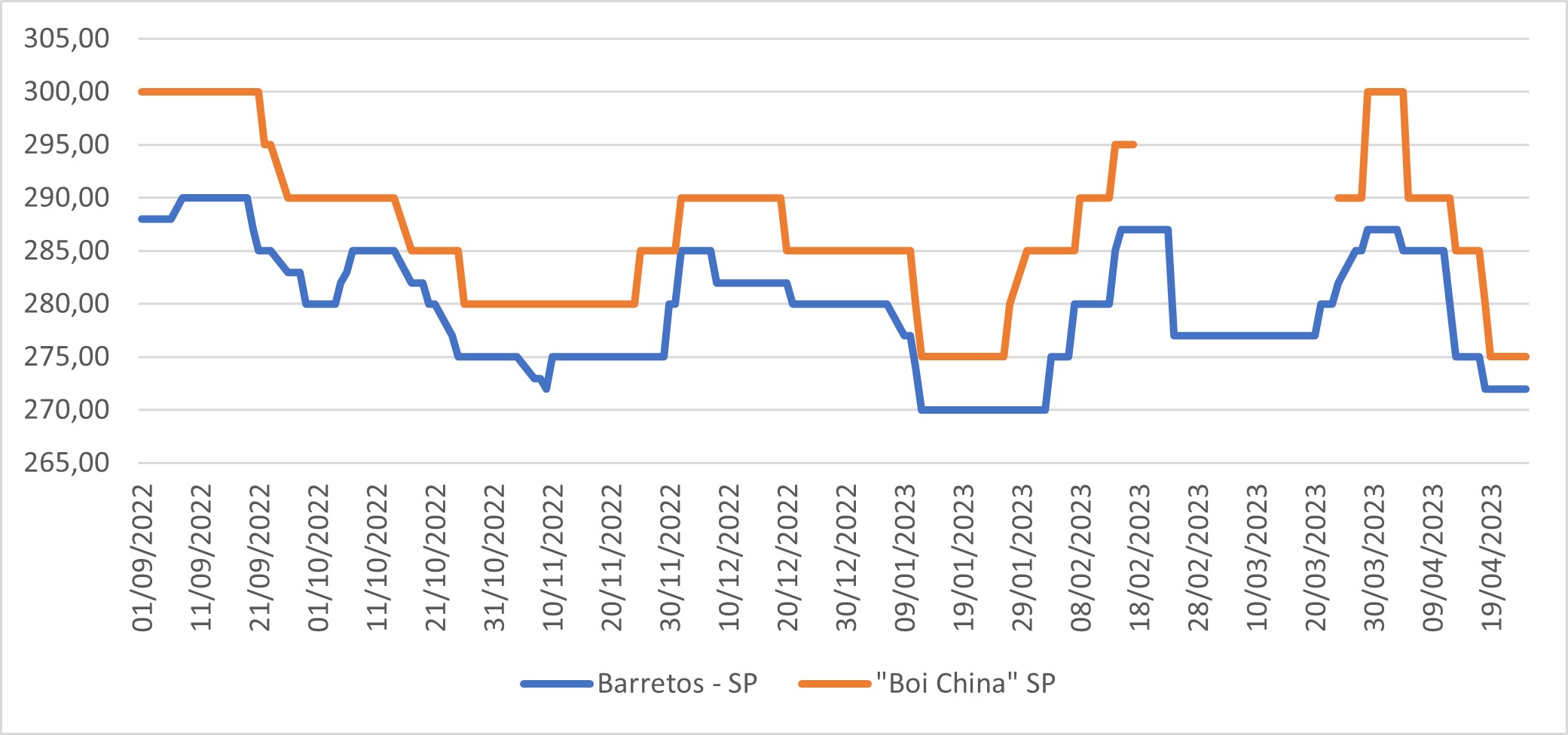 Desde 13 de abril, vemos um movimento descendente para a cotação da arroba, tanto do boi comum quanto do “China”. Veja o comportamento dos preços do boi gordo (R$/@), em São Paulo, na figura 1.