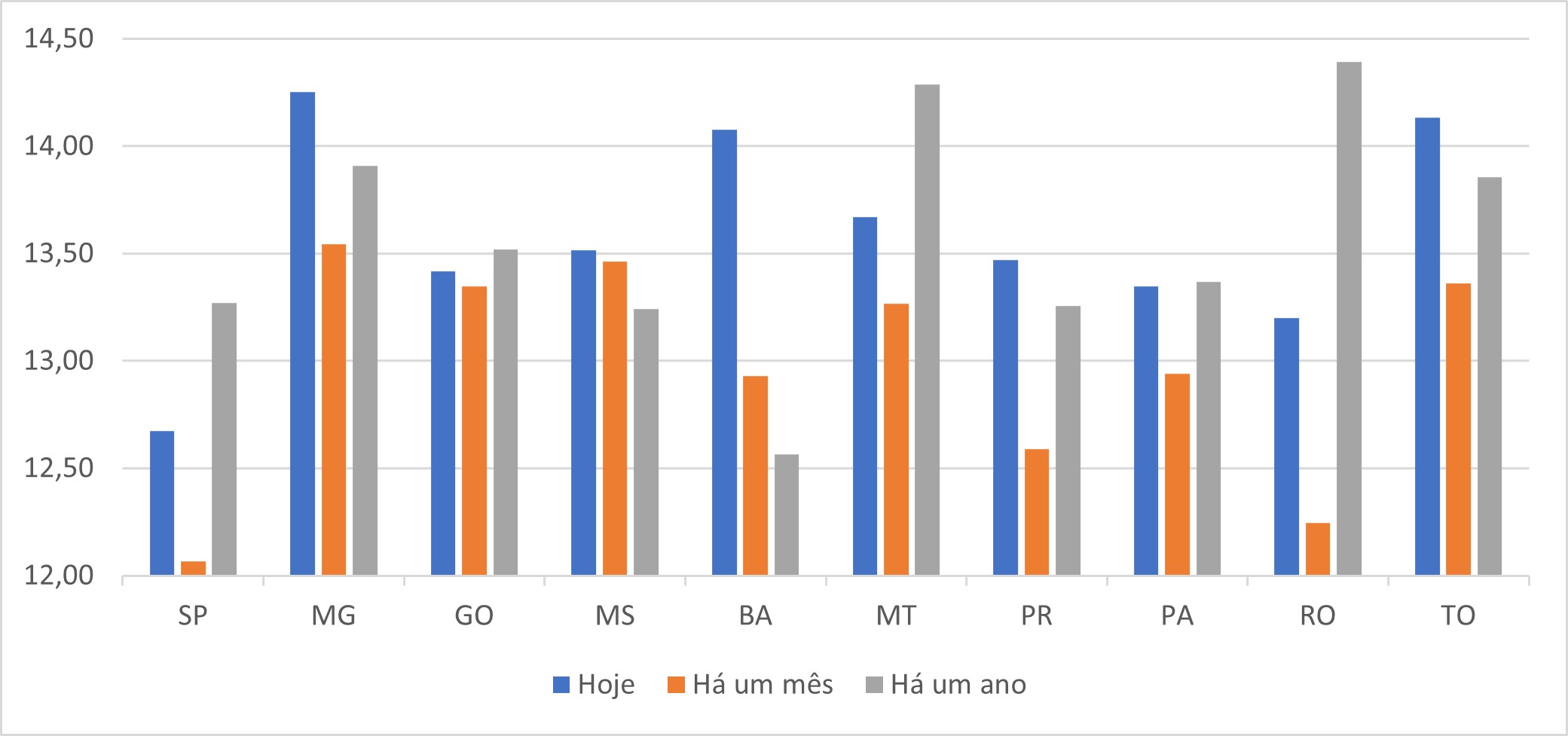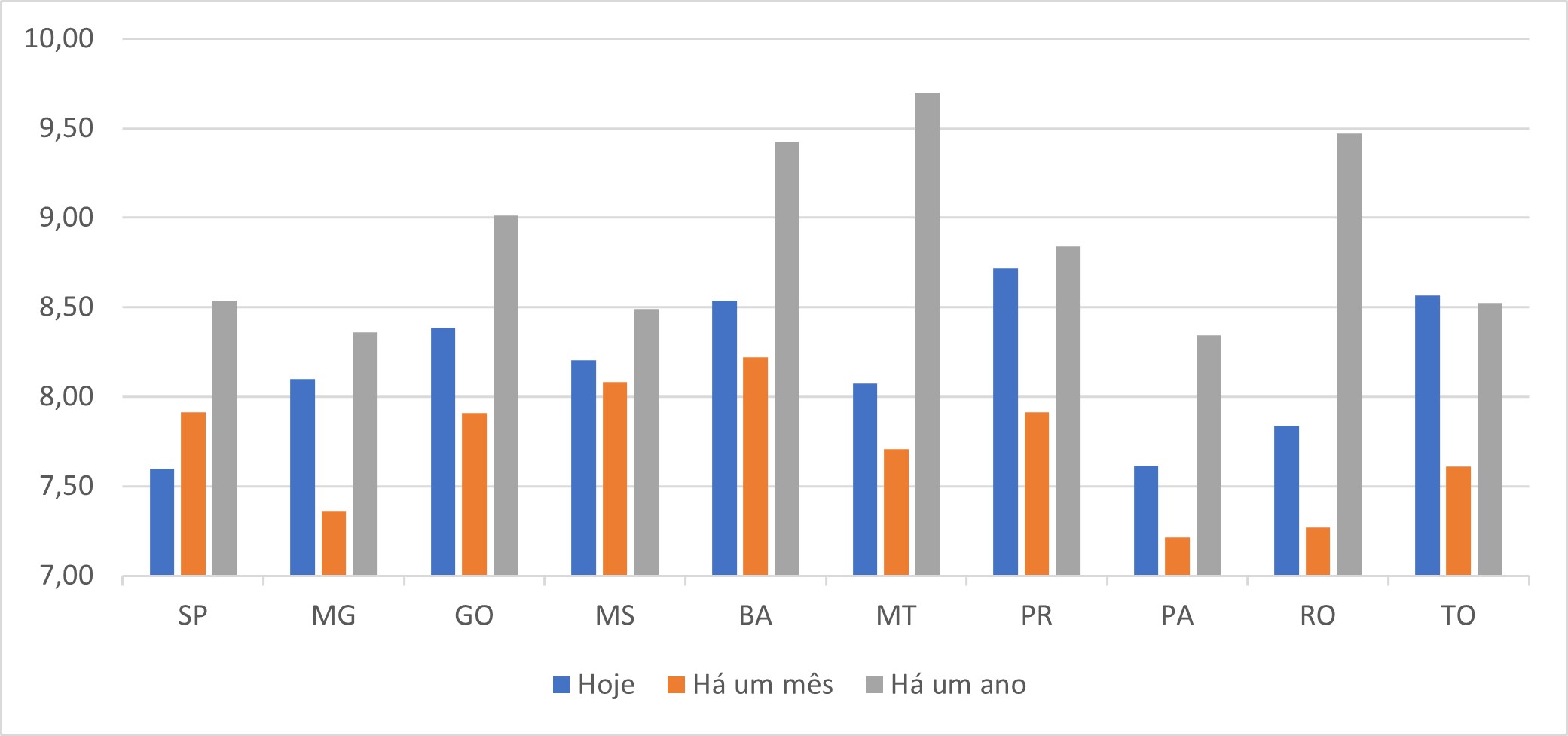 O mesmo cenário foi visto para a relação de troca com o boi magro no Tocantins. Em Minas Gerais, Mato Grosso do Sul, Bahia e Paraná, também houve queda no poder de compra. Isso mostra que é necessário um acompanhamento refinado dos custos, a fim de realizar bons negócios de curto prazo. Veja na figura 3.