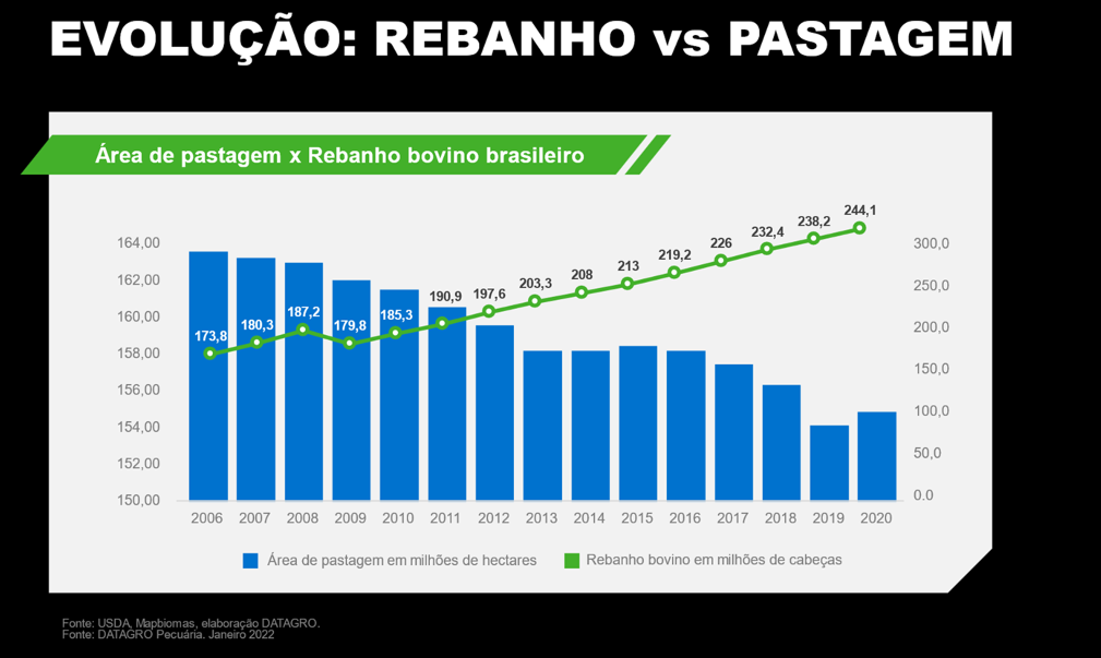 Estudos apontam que o Brasil tem registrado diminuição das áreas de pastagem, ou seja, a pecuária vem cedendo áreas para outras culturas na agricultura - como soja, milho, eucalipto, cana, além de regenerar algumas áreas de floresta. Ao mesmo tempo, a pecuária vem aumentando o tamanho do rebanho.