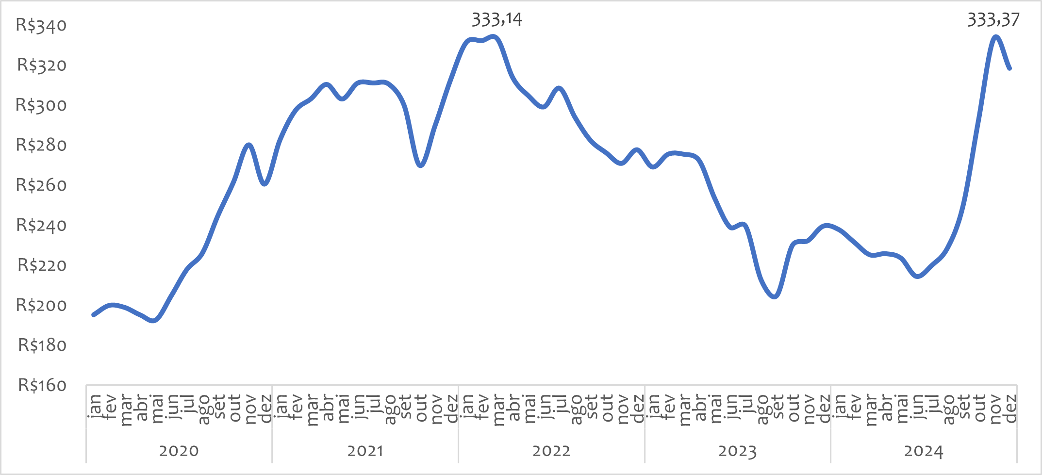Considerando a média anual de preços deflacionados, porém, o preço médio aumentou 0,1% e o ajuste real em 2024 foi puxado, principalmente, pela recuperação na cotação no último trimestre.