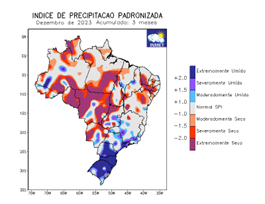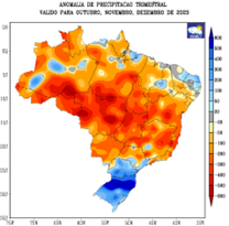 Índice de precipitação padronizada e anomalia de precipitação (mm) trimestrais, considerando outubro, novembro e dezembro de 2023.