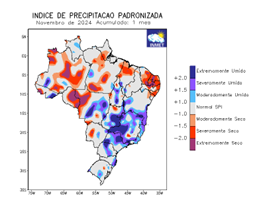 Índice de precipitação padronizada e anomalia de precipitação (mm) trimestrais, considerando setembro, outubro e novembro de 2024.