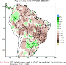 Anomalia de precipitação (mm) acumulada no Brasil em dezembro (27/11/24 a 26/12/24), à esquerda, e expectativa de anomalia de precipitação para o período entre 3 e 9 de janeiro de 2025, à direita.