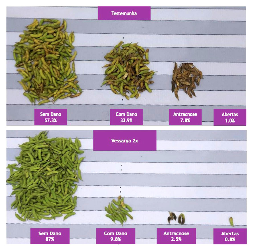A soja que não recebeu aplicação de Vessarya® apresentou cerca de 18% dos grãos danificados, enquanto na lavoura tratada com o produto apenas 6,8% dos grãos apresentavam danos.