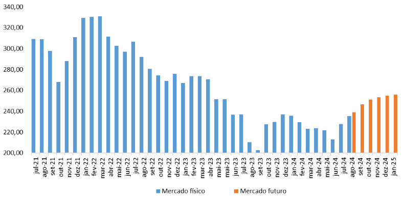 Portanto, a firmeza no mercado, aparentemente, veio para ficar. O mercado futuro aposta nesse cenário, com alta das cotações até o fim de 2024 – veja na figura 2.