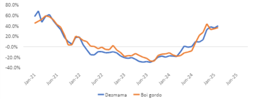 Figura 2. Variação entre os preços mensais de um ano ao outro (YoY) dos preços pagos pela arroba do boi gordo e desmama, em São Paulo.