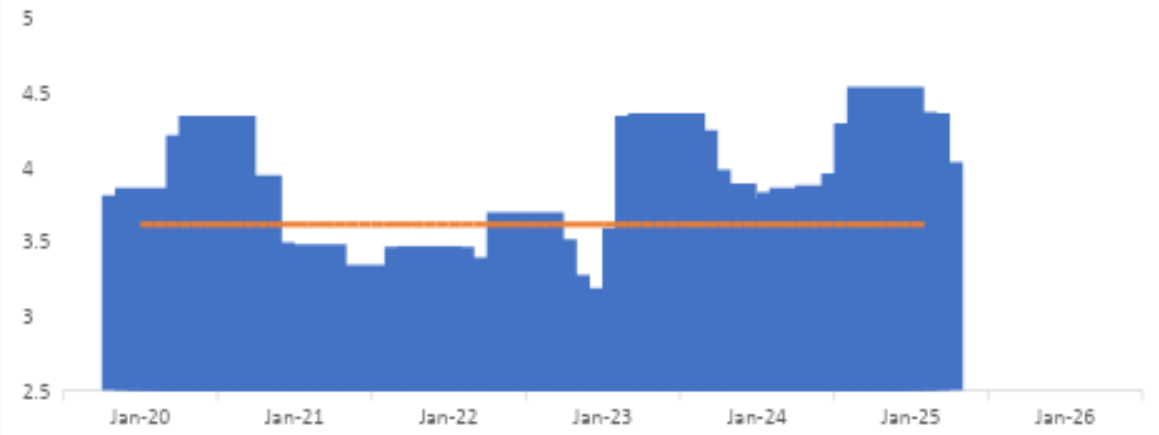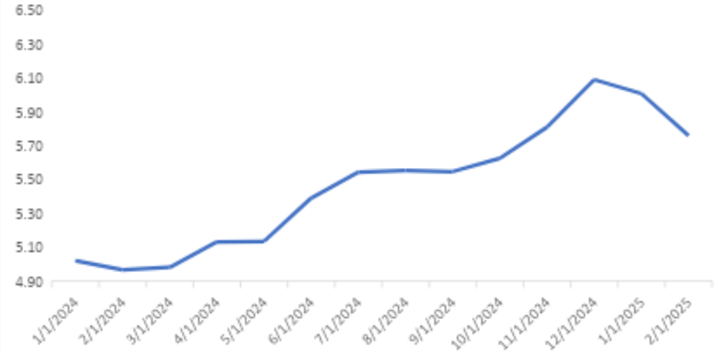 Figura 4. Câmbio mensal do dólar, entre 2024 e 2025.