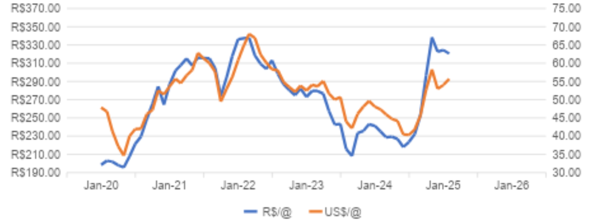 Ou seja, quando o real se enfraquece frente ao dólar, o repasse de preços da arroba do boi gordo na moeda estrangeira é limitado. Assim como aconteceu no fim de 2024, o enfraquecimento do real limitou a alta dos preços internacionais da arroba do boi gordo brasileiro.
