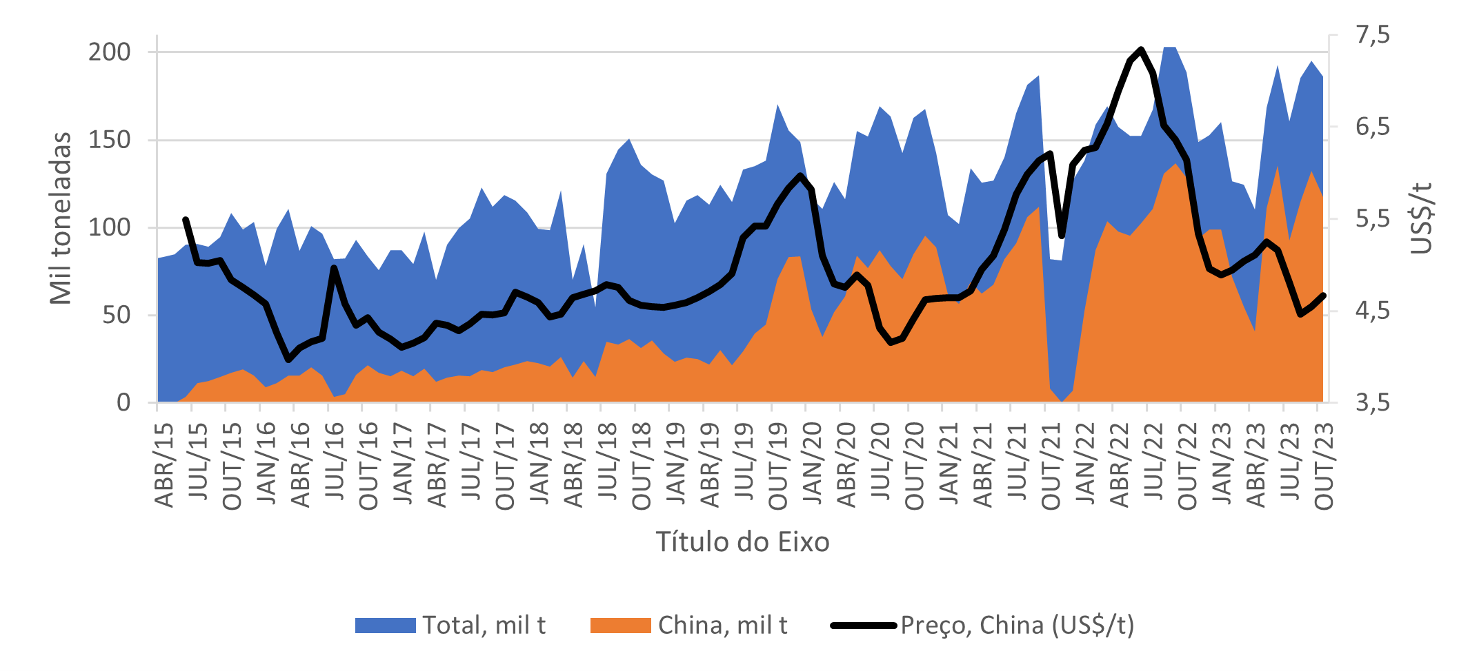Exportação de carne bovina in natura, mês a mês, em mil toneladas (em azul), exportação à China (em laranja) e o preço pago pela China pela tonelada de carne bovina exportada (linha preta), desde 2015