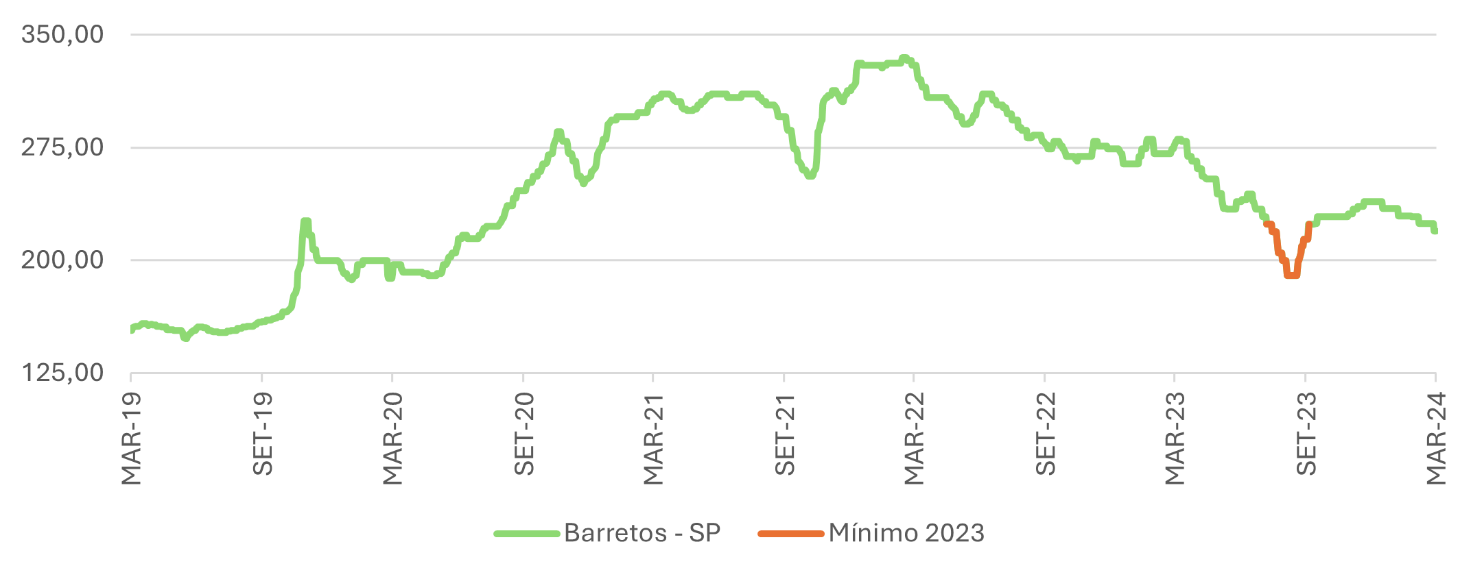 Seguimos em fase de baixa no ciclo pecuário de preços, com a perspectiva de um ano de transição em 2024, podendo ocorrer ajustes positivos, principalmente para os bovinos de reposição a partir do segundo semestre.