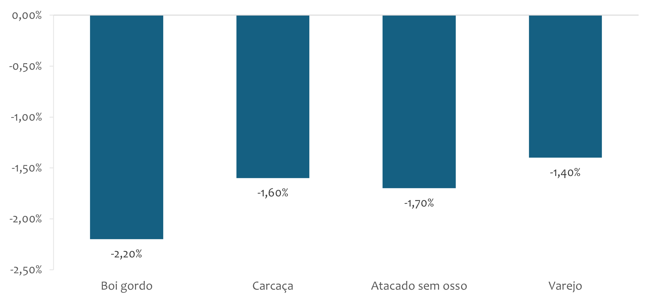 Variação, em trinta dias, das referências ao longo da cadeia de produção de carne bovina.