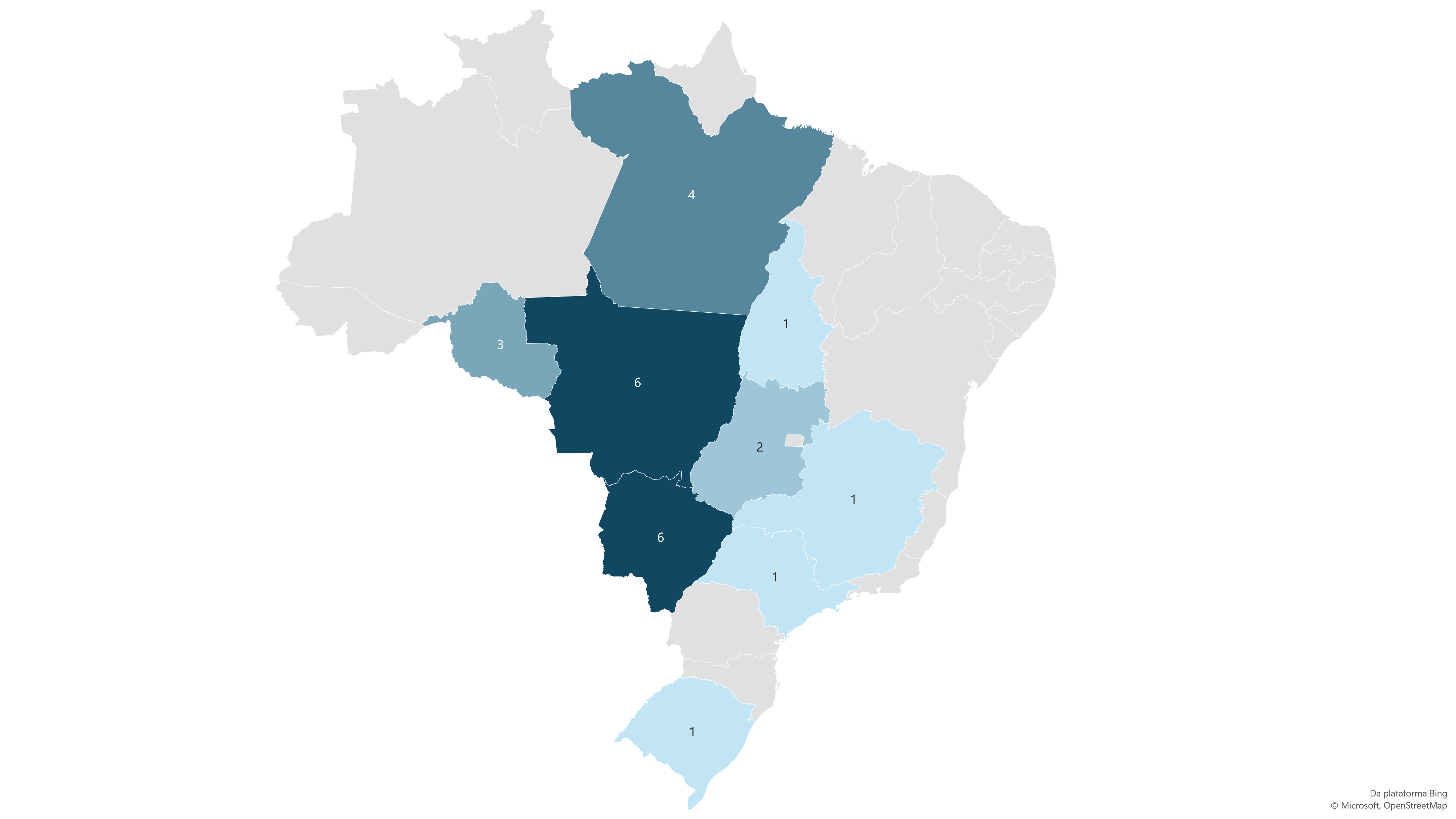 As plantas habilitadas para a exportação de carne bovina e carne bovina termoprocessada estão em Mato Grosso (6), Mato Grosso do Sul (6), Pará (4), Rondônia (3), Goiás (2), São Paulo (1), Tocantins (1), Minas Gerais (1) e Rio Grande do Sul (1). Acompanhe na figura 1 a distribuição.