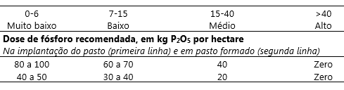 As doses recomendadas pelo agrônomo poderão ser maiores ou menores do que as da referida tabela, dependendo do tipo de gramínea (Panicum, Elefante, Coast-cross, Tifton são mais exigentes; braquiárias são menos exigentes), do nível de exploração, da lotação animal etc.