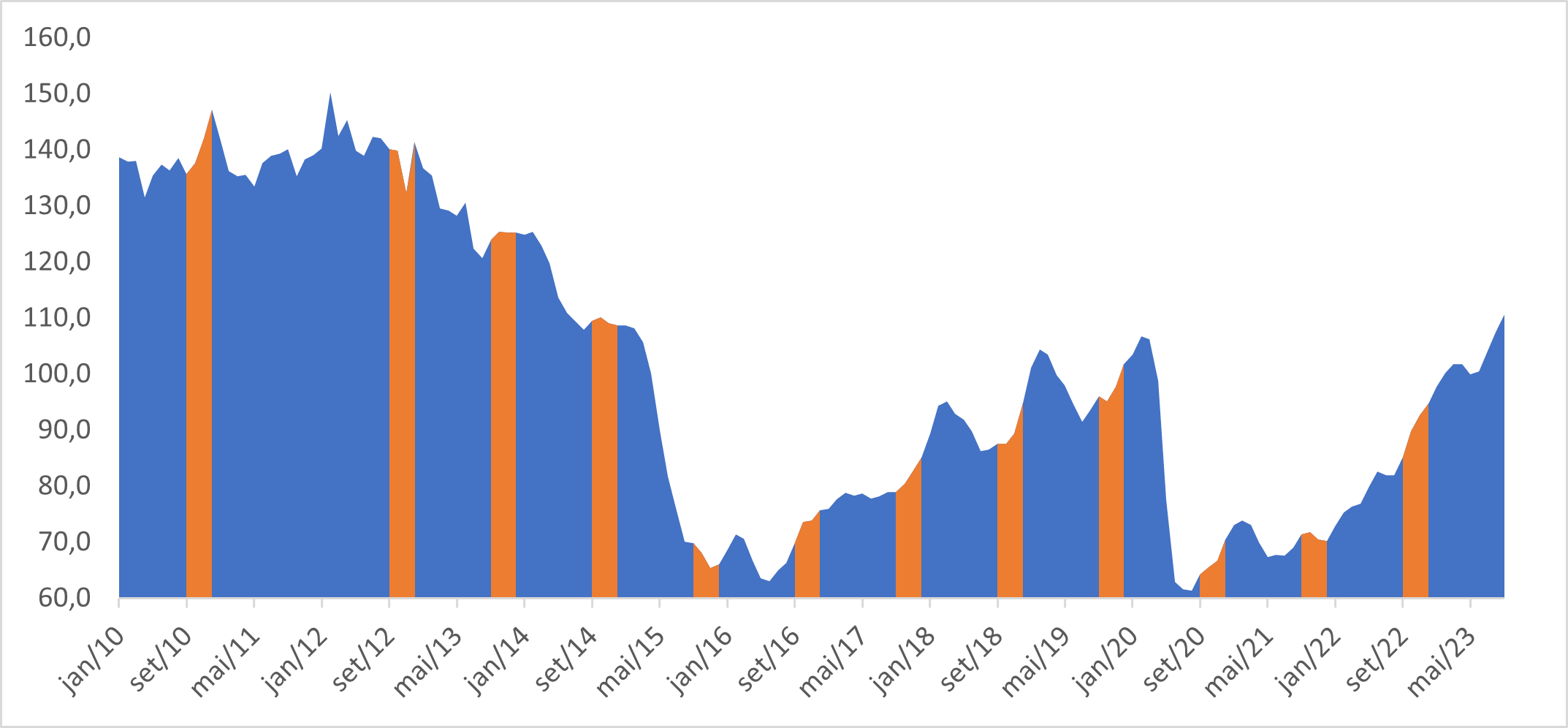 O Índice de Intenção de Consumo das Famílias (ICF), medido pela Confederação Nacional do Comércio (CNC), alcançou seu melhor nível pós-pandemia em agosto/23, veja na figura 2. O índice, historicamente, também tem melhor desempenho que os meses anteriores – pontos em laranja.