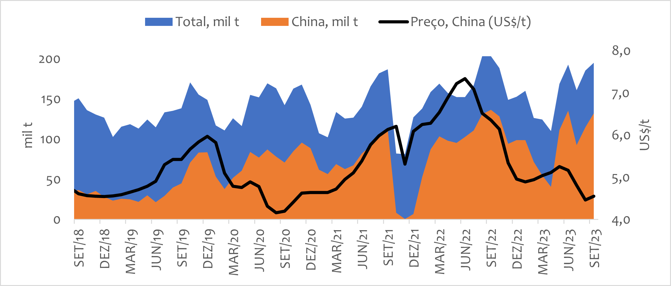 Do lado da exportação, o ritmo de compras é crescente desde a virada de semestre, consolidando a expectativa de boa demanda que apontamos aqui em outras oportunidades. O preço, com destaque à China, nosso principal cliente, porém, segue sendo o grande entrave à indústria exportadora.