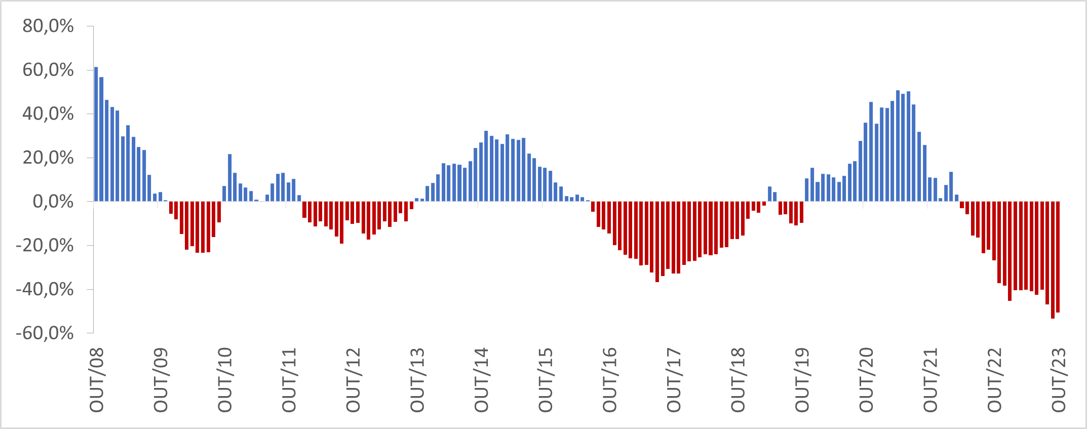 Para o Brasil, 2023 deverá registrar uma queda de 5,1%, com crescimento de 3,6% em 2024, na comparação anual. Com o fim de outubro, a estimativa para este ano é mais uma constatação do que uma projeção e está em linha com os dados de embarques que temos até o momento. Cabe lembrar que esse recuo será frente ao maior volume já embarcado, em 2022 - ou seja, de todo modo, não é um ano ruim em termos de volumes.