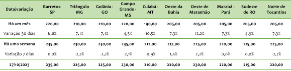 Veja na tabela 1 a cotação na praça paulista e em outras praças pecuárias relevantes.
