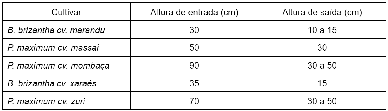 É importante ressaltar que as alturas de entrada e saída para primeiro pastejo variam conforme a cultivar (tabela 1), não devendo ser ultrapassadas, evitando problemas na pastagem, como menor valor nutricional, menor produtividade, perdas por acamamento, menor eficiência de pastejo e rebrota mais lenta.