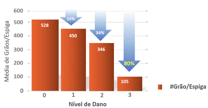 Os ensaios realizados pela Corteva mostraram que a produtividade de grãos por espiga diminui conforme o nível de dano causado pelos percevejos. Em uma população de 55 mil plantas por hectare, 1% das plantas danificadas no nível 3 resulta na perda de 80 kg de grãos de milho.