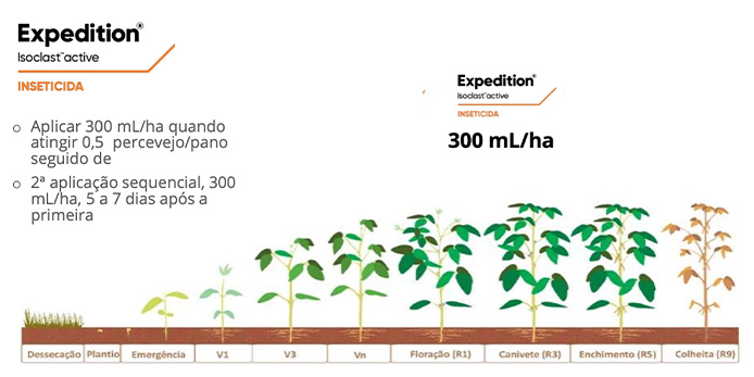 Para colher melhores resultados no controle de percevejos, a primeira aplicação de Expedition® deve ser realizada no início da formação de vagens, ou seja, no canivetinho da soja, e no ponto de palito do milho. Já a reaplicação, na soja, deve ser feita quando atingir o nível de controle entre 0,5 a 1,0 percevejo por pano de batida, enquanto no milho deve ser feita 5 dias após a primeira aplicação.